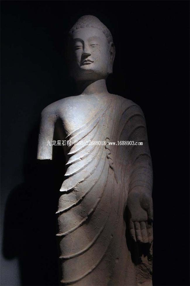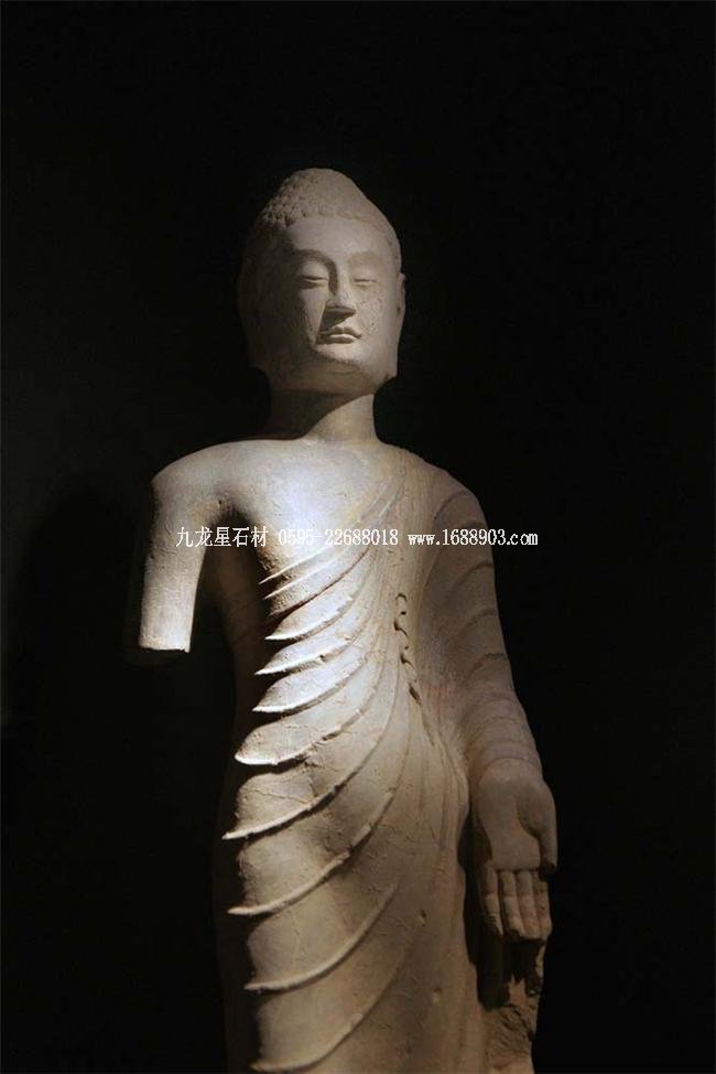 北魏、北齊時期,佛像雕刻藝術(shù)趨于巔峰極致之境界。北魏佛像造型挺拔秀美,細(xì)腰寬背,衣紋是富于裝飾的淺刻。北齊造像多為面型豐腴,衣紋簡潔,服薄貼體,整體平潤光潔,與面部寧靜安祥的表情和諧一致。這類疏簡淳潤的佛像造像,無論從光潔的肌體或平滑衣物里,似乎都能感覺到內(nèi)部筋肉的輕微變化。潤澤的體面與舒緩下垂的線條,使形象在疏簡平淡中流露出內(nèi)在的氣質(zhì)。