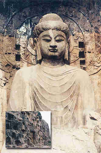 河南洛陽(yáng)城南的龍門石窟,力經(jīng)東魏、北齊、隋、唐多個(gè)朝代之開(kāi)鑿,作品龐雜,遺留作品也較多。可惜的是,解放前被外國(guó)列強(qiáng)盜去了許多造像以及頭、手臂等局部,造成了無(wú)法挽回的損失。賓陽(yáng)中洞是龍門石窟中比較重要的一處,是北朝時(shí)期有史實(shí)可查的,其形制結(jié)構(gòu)與云岡曇曜五窟相似,窟內(nèi)飾有蓮花、飛天、云氣等圖案,氣氛神秘、紋飾華麗,但無(wú)瑣碎之感;蓮花洞內(nèi)的石雕蓮花特別突出,窟內(nèi)主佛像為站立姿勢(shì),手臂的雕刻尤為動(dòng)人,,似有柔軟彈性之感;古陽(yáng)洞是龍門石窟中較大的一個(gè),歷史年代也較早,最有代表性的是在洞內(nèi)壁面上雕滿了小佛龕,幾乎每龕都有造像題記,中國(guó)著名的書法碑帖“龍門二十品”中,古陽(yáng)洞中的就有十九品。