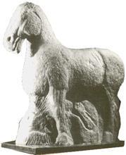 雖然在整個(gè)雕塑史中,秦代只占據(jù)著短短的十五年,但只一個(gè)兵馬俑的出現(xiàn),就足以改變中國(guó)雕塑史。它出土于1974-1976年,主要以兵俑和馬俑居多。體態(tài)與真人等大,數(shù)量眾多,神態(tài)各異;自是有立、有跪,有馭手、射手;由軍官、士兵之分。馬俑形象寫實(shí),身材矯健,可見(jiàn)當(dāng)時(shí)雕塑者對(duì)生活觀察之細(xì)致、對(duì)塑造技術(shù)支精通。這些秦始皇百萬(wàn)大軍的縮影都是用陶土燒制而成,不論是造型、塑造、燒制等各個(gè)環(huán)節(jié),都是一件龐大的工程。一般采用模制加手工塑型的技術(shù),分段成型,整體焙燒。其陶泥制的細(xì)膩、燒成火焰均勻、過(guò)程當(dāng)中變形較小,燒成后外表用顏料彩飾。作品注重面部形象刻畫,據(jù)說(shuō)萬(wàn)千兵馬俑沒(méi)有充樣、雷同的,可用“栩栩如生”這個(gè)詞來(lái)形容。從人物結(jié)構(gòu)上看,比例合適,動(dòng)態(tài)自然。秦俑的單件作品都有很強(qiáng)的動(dòng)作個(gè)性,有的手持利劍,有的佇立凝視,有的堅(jiān)定剛毅。但整體上不在乎細(xì)節(jié)變化,不是完全照搬現(xiàn)實(shí),在軀方頭圓上有強(qiáng)烈的體塊對(duì)比、疏密變化、動(dòng)靜之別。