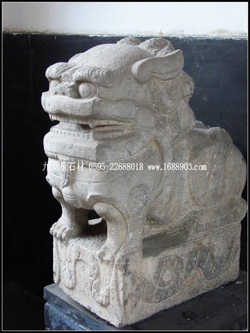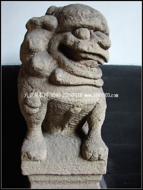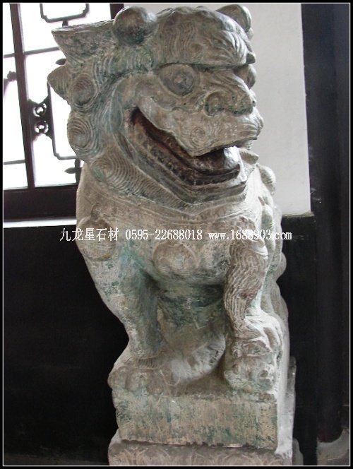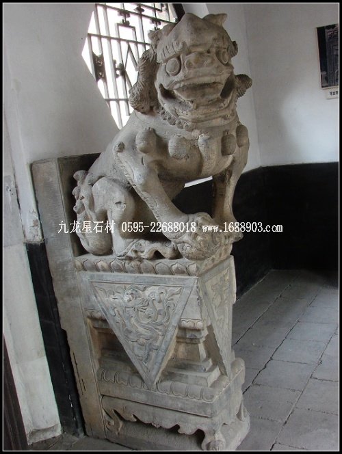 子是莊園青石雕刻的又一大類別。眾多的門墩石獅,經(jīng)清代民間藝術(shù)家的大膽想象、沿承、夸張,這一藝術(shù)品成了宅第建筑中不可替代的裝飾像,無論體量大小,均威武、高貴而又憨態(tài)可掬。為增強裝飾效果,莊園的獅子形象大多頭大臉闊,額隆頰豐,箕口肉鼻,前額突出,從禿頂式的頭部到項背披有漩式鬣毛。胸飾纓絡華飾,脖上掛有鈴鐺,形態(tài)俯首縮足。雌獅掌撫幼獅,有的還背負其子;雄獅腳踏繡球或嘴銜彩帶,背負繡球,較多地汲取了民間傳統(tǒng)舞獅藝術(shù)的成分,富有較強的鄉(xiāng)土氣息和喜慶風格。