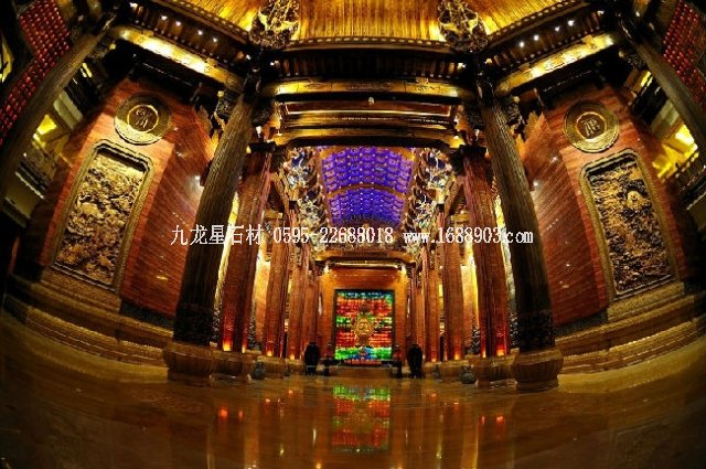 梵宮的內(nèi)部,舉目可見東陽木雕、敦煌壁畫、揚州漆器、景泰藍、琉璃、溫州甌塑等等藝術珍品。能將如此眾多的中國非物質(zhì)文化遺產(chǎn)納入一座建筑的,目前似乎只有梵宮,也因此,有人稱它為“東方的盧浮宮”。由于梵宮顛覆了中式宗教建筑的傳統(tǒng)理念,舍棄了中國傳統(tǒng)佛教建筑慣用的木頭、琉璃瓦等材料,而用鋼筋混凝土建造,因而為設計施工帶來了很大難度。