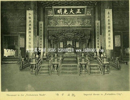太和殿內(nèi)的主要陳設(shè)還有皇帝的寶座,寶座前設(shè)腳踏及香筒、甪端、仙鶴、寶象等。陛間陳設(shè)香爐。殿內(nèi)墁地金磚是專門(mén)為皇宮燒制的細(xì)料方磚。之所以叫金磚是因?yàn)檫@種磚質(zhì)地細(xì)密,敲之有金石之聲,故名。