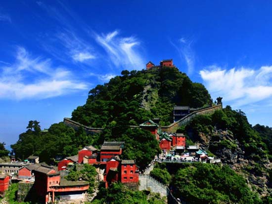 武當(dāng)山又名“太和山”,位于中國中部湖北省丹江口市的西南部。相傳為道教玄武大帝(北方神)修仙得道飛升之勝地, 歷代道教名流曾在此修煉。據(jù)記載, 唐太宗貞觀年間即在靈應(yīng)峰創(chuàng)建五龍祠。宋、元以來, 代有開拓擴(kuò)建。明成祖于永樂十年(1412)曾動用軍夫30多萬人在此大興土木?,F(xiàn)存的36處宮觀大多是明代所建, 是中國現(xiàn)存最完整、規(guī)模最大、等級最高的道教古建筑群。宮觀內(nèi)保存的各類神像、法器、經(jīng)籍等都有較高的文物和藝術(shù)價值。明代(公元1368~1644年)時,武當(dāng)山被皇帝敕封為“大岳”、“玄岳”,地位在“五岳”諸山之上。武當(dāng)主峰天柱峰,海拔1612米,周圍又有“七十二峰”、“三十六巖”、“二十四澗”等勝景環(huán)繞,風(fēng)光旖旎,氣勢宏偉,被世人贊為“萬山來朝”。
