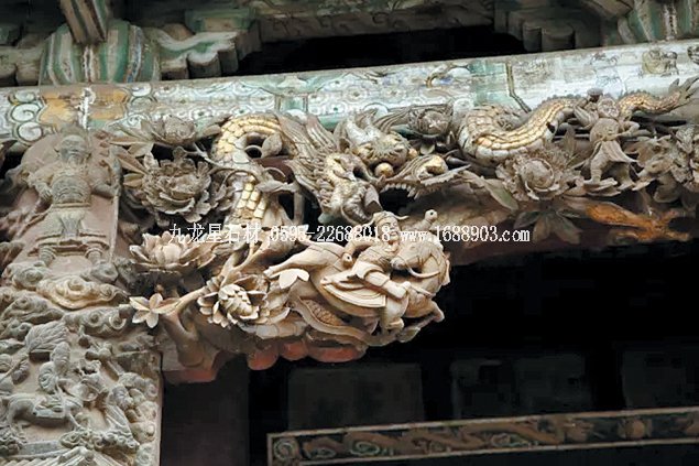 三義殿前廊上排列的四根人物石柱每根柱上都雕有人物故事。從東面往西看起:第一根石柱上雕刻的是人們熟悉的“郭子儀子婿拜壽”的場(chǎng)景片段:柱上“七子八婿,皆顯貴朝廷”。郭子儀端坐堂上,喜形于色,享受著兒女們的孝道之心。在其周圍,還有官員、女眷、士兵、家丁、童子、樂手等人物,姿態(tài)各異,栩栩如生。第二根石柱上人物更加豐富,從下到上處處分布著人物,主要故事為瓦崗寨的故事,立于城墻內(nèi)的人物分別有持月牙板斧的瓦崗寨寨主程咬金,慣用殺手锏的秦瓊,手拿梅花槍的羅成等。第三根柱子上雕刻的是悠然釣魚的姜太公,踏著風(fēng)火輪的哪吒三太子,凌空展翅的雷震子,游走地下的土行孫。第四根柱上,雕刻著盛唐時(shí)期山東壽張縣百歲老人張公藝九世同堂和治家有方的故事。(侯楠山)