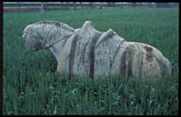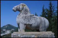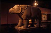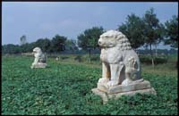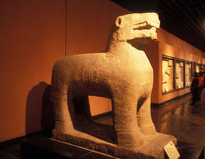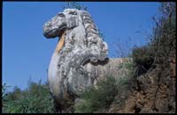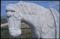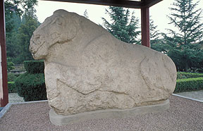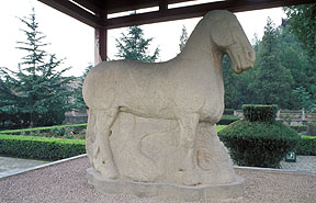古代陵園石雕遺存實物最早的是引人注目的西漢霍去病墓石雕,作品原在陜西省興平縣漢武帝茂陵東面霍去病墓上與墓前?,F(xiàn)已發(fā)現(xiàn)的石雕作品有造型各異、天趣宛然的動物、人物等共十四件?;羧ゲ槲鳚h名將,漢武帝為表彰其功、紀(jì)念其人,于茂陵東面選定其墓址并“為冢象祁連山”,據(jù)《史記?衛(wèi)將軍驃騎傳?索隱》記:其墓“冢上有豎石,前有石馬相對,又有石人”。今存作品即記載中的部分原物。它們可以分為兩類,一是通常被稱之為“馬踏匈奴”的立馬,二是其它渚石。立馬的原在位置是墓前不遠(yuǎn),長年來未有大的移動,從形式上看為靜立姿態(tài),尺度適中,符合一般早期墓前石雕的制作規(guī)律,相信此即記載中相對而立的石馬,只是另一件已無存,“石人”也不見了。唐薛逢《漢武帝祠》詩云:“茂陵煙雨埋弓箭,石馬無聲蔓草寒”。詩中所指茂陵石馬當(dāng)系帝陵制度,但與霍墓立馬的位置及造型表現(xiàn)肯定有直接關(guān)系。西漢時期陵園墓前設(shè)置石雕已成風(fēng)氣,關(guān)于石人石獸的記載與遺存并不罕見,因此霍去病墓前石馬并非例外,實屬常規(guī)設(shè)置,它為我們提供了代所完善的石象生設(shè)置與造型形式之源的現(xiàn)知最早實物證據(jù)。