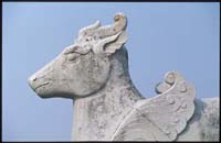 漢代墓葬手段逐漸完善之時,神靈的偶像也大規(guī)模出現(xiàn),它們體現(xiàn)著人們對神的認(rèn)識、崇拜和依賴,它被認(rèn)為會給陵墓帶來吉祥,給墓主靈魂以庇護和幫助,會驅(qū)逐鬼怪邪祟。魏晉南北朝時期這種偶像化更為明顯,為后代確定了神靈崇拜的偶像模式。陵園神道兩側(cè)列置著石雕天祿辟邪;墓室里陳放著陶塑的鎮(zhèn)墓獸;壁畫描繪著羽人、飛天、神靈;墓門棺槨上也刻劃著方相氏的形象。前代的這種審美表現(xiàn)因素影響著唐陵石雕藝術(shù)表現(xiàn)的一個重要方面,即歸結(jié)出天馬、天鹿等神靈崇拜的占有一定比例的造型表現(xiàn)部分。末陵石雕的角端、瑞禽明清陵園石雕的麒麟、獬豸等都是這種基礎(chǔ)內(nèi)容模式的演變。先民們試圖通過陵墓這一特殊的環(huán)境達到人與神的有效溝通,在這個意義上造型手段起著關(guān)鍵性作用。陵墓被視為人神共處的理想化的虛幻而可信的環(huán)境,在這里天國、人間、地獄融為一體,形成完整的世界??梢哉f,對神靈的崇拜心理和原始宗教的世界觀是決定墓葬表現(xiàn)形式的重要因素。