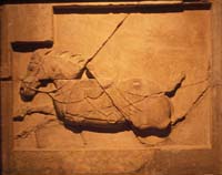 “昭陵六駿”,與其說是表現(xiàn)雕刻的美不如說是表現(xiàn)繪畫的美。據(jù)記載,昭陵是在杰出美術(shù)家閻立德主持下修建的,并由其弟閻立本圖繪十四國君長像為石刻范本?,F(xiàn)存十四國君長像頭部殘塊顯示的確有寫真特征,面部皺紋用線刻形式加以表現(xiàn),甚至眼角的紋路亦不放過,形象追求“寫真性”,突出個人的容顏特點,在某種程度上帶有一定的摹刻繪畫性,不同于一般的石人?!傲E”所表現(xiàn)的是唐太宗征戰(zhàn)慣用的六匹戰(zhàn)功馬,宋游師雄題《六駿碑》中記述了石刻當(dāng)時安置的次序:颯露紫(西第一)、特勒(勤)驃(東第一)、拳毛馬咼 (西第二)、青騅(東第二)、白蹄烏(西第三)、什伐赤(東第三)?!傲E”表現(xiàn)為類似于漢畫象石刻中浮雕的形式,在方形外框中刻畫馬的側(cè)面形象,韻致非常接近于唐代繪畫中馬的表現(xiàn)。“六駿”是具體指象,即“刻石為常所乘破敵馬六匹”(《唐會要?卷二十》),有形象的特定要求,而且選擇了戰(zhàn)馬中箭、奔馳、療傷的情節(jié)并刻畫出了馬頸部的“三花紋”這類細(xì)節(jié)。這都宜于繪畫表現(xiàn)而不宜于圓雕表現(xiàn)。既然人像石雕可以繪畫為范本,馬的石雕當(dāng)然也完全可能以繪畫為范本。昭陵沒有效法圓雕形式表現(xiàn)鞍馬,原因之一就在于類似畫象石的浮雕形式更便于傳達繪畫性表現(xiàn)內(nèi)容,避免圓雕所受的材料限制,從而傳達“六駿”特有的紀(jì)實性審美意味。