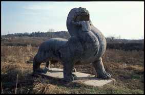 中原地區(qū)從戰(zhàn)國秦漢興起的在墓前設(shè)置石雕人物、動物雕像的風(fēng)氣在唐代已經(jīng)波及到少數(shù)民族居住地區(qū),但由于各自不同的生存環(huán)境、文化傳統(tǒng)、生活方式及受到外來文化影響程度等原因,石雕作品的內(nèi)容與形式和中原密切聯(lián)系的同時又有明顯差異。位于吉林省敦化縣的渤海國前期王族墓地現(xiàn)存石獅兩尊,造型與中原唐陵早期作品十分相似,同時不失北方部族藝術(shù)的雄渾質(zhì)樸風(fēng)氣,顯示了中原文化的明顯滲透。