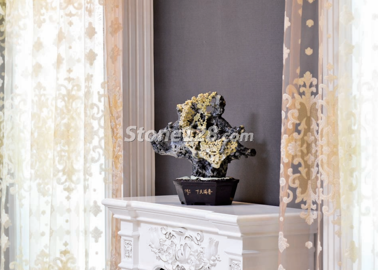 在新中式風(fēng)格的大廳中,石雕作品的外形與背景窗花的菱形相互協(xié)調(diào),取得了很好的諧調(diào)效果。石雕的色彩與整體環(huán)境的深色調(diào)相互統(tǒng)一,臘梅花典雅的黃色又活躍了色彩的意境氛圍。整體空間的直線風(fēng)格與石雕作品的曲線造型相對(duì)比,剛?cè)嵯酀?jì),收放有度,取得了很好的視覺效果。