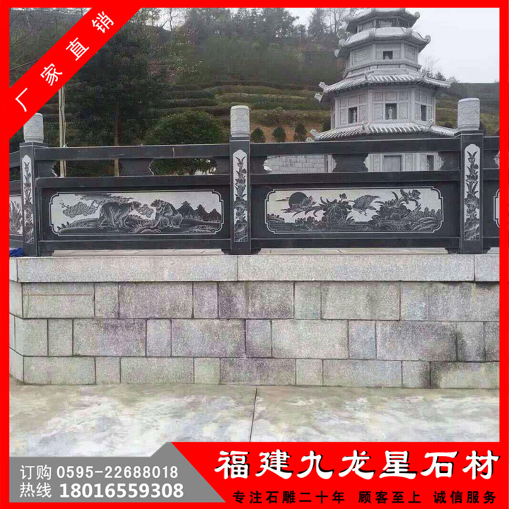 青石石雕欄桿表面色澤均勻,外觀光彩奪目,猶如那湖中的蓮花般出淤泥而不染,在維護人們安全時給予人們一種溫馨而美好的意境。青石欄板上的圖案更是各有千秋耀眼奪目,有刻畫著山水情懷,有亭臺樓閣,有圖文并茂,有人魚鳥獸等。在各個地方展現著不一樣的風采。