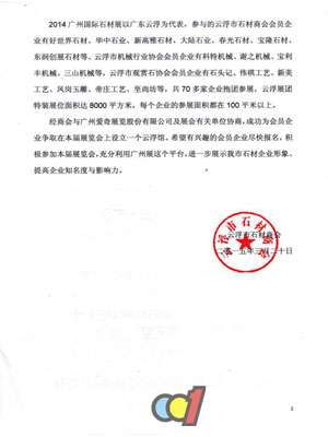 2015年3月20日,云浮市石材商會也發(fā)出了云石商字(2015)第02號文,希望云浮的石材企業(yè)也積極報名參展,云浮石材企業(yè)在云浮石材商會、云浮機械協(xié)會、云浮觀賞石協(xié)會的帶領(lǐng)下,2014年的參展面積達到了8000平方米,2015年的參展面積預計將會突破10000平方米,云浮市石材商會與廣州石材展簽署三年的戰(zhàn)略合作協(xié)議,每年的參展規(guī)模將會上漲20%以上。