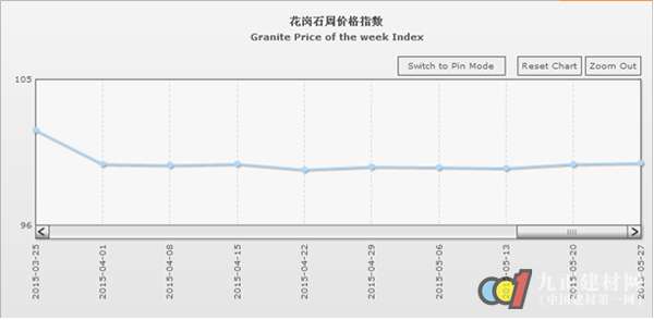 據(jù)“中國(guó)·水頭石材指數(shù)”系統(tǒng)監(jiān)測(cè),20150527期石材周價(jià)格指數(shù)收?qǐng)?bào)于98.71點(diǎn),環(huán)比略上浮0.08點(diǎn),上浮約0.08%。本周石材價(jià)格指數(shù)延續(xù)上周穩(wěn)中微升的趨勢(shì)、繼續(xù)微幅推升,其中其他石材類(lèi)價(jià)格環(huán)比持平外,大理石、花崗石、合成大理石類(lèi)價(jià)格均有所回升。大部分品類(lèi)價(jià)格變化仍較穩(wěn)定,部分品種價(jià)格因市場(chǎng)需求有所增加及板面質(zhì)量差異小幅上揚(yáng)。