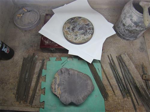工作臺上放著一方尚未完工的硯臺,是幾朵的蘑菇的形態(tài)。應調(diào)研團成員的要求,胡楊老師給調(diào)研團的成員們展示了現(xiàn)場雕刻,他用一根細長頭尖的鑿子輕輕地雕刻一只爬在蘑菇上的螞蟻,每一鑿,不論力度還是位置都十分精準,令調(diào)研團成員非常欽佩贊嘆。胡楊老師表示自己還是很向往大師陳端友歷時三十載制成九龜荷葉形端硯的精雕細琢,他們應該將生活節(jié)奏放慢,只有摒棄五光十色的浮華,寧靜淡泊,才可以在石雕雕刻的道路上有所感悟、有所收獲。