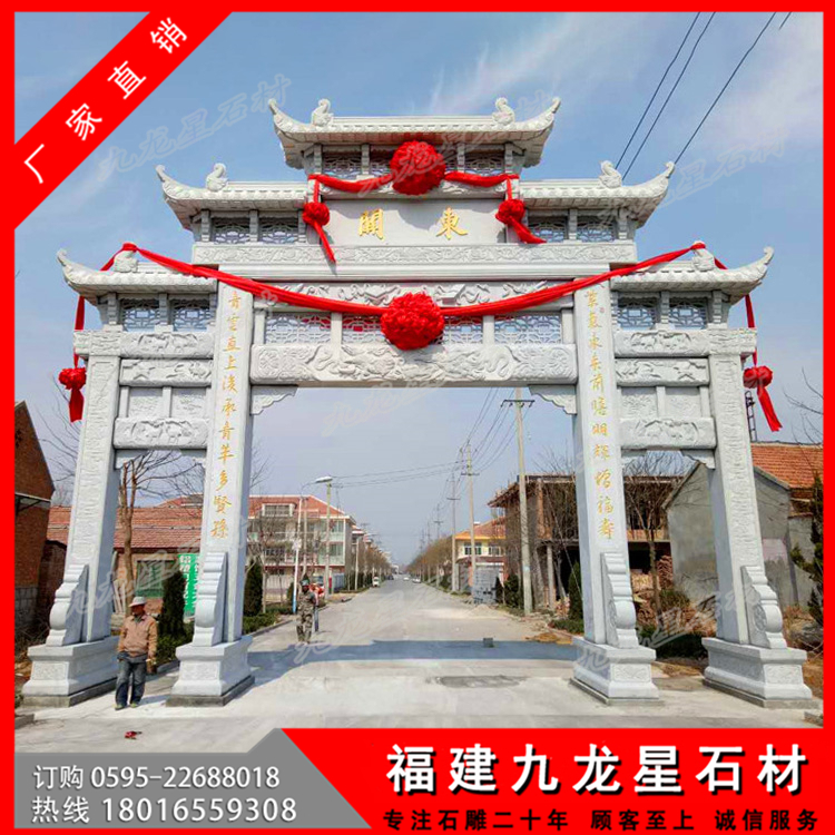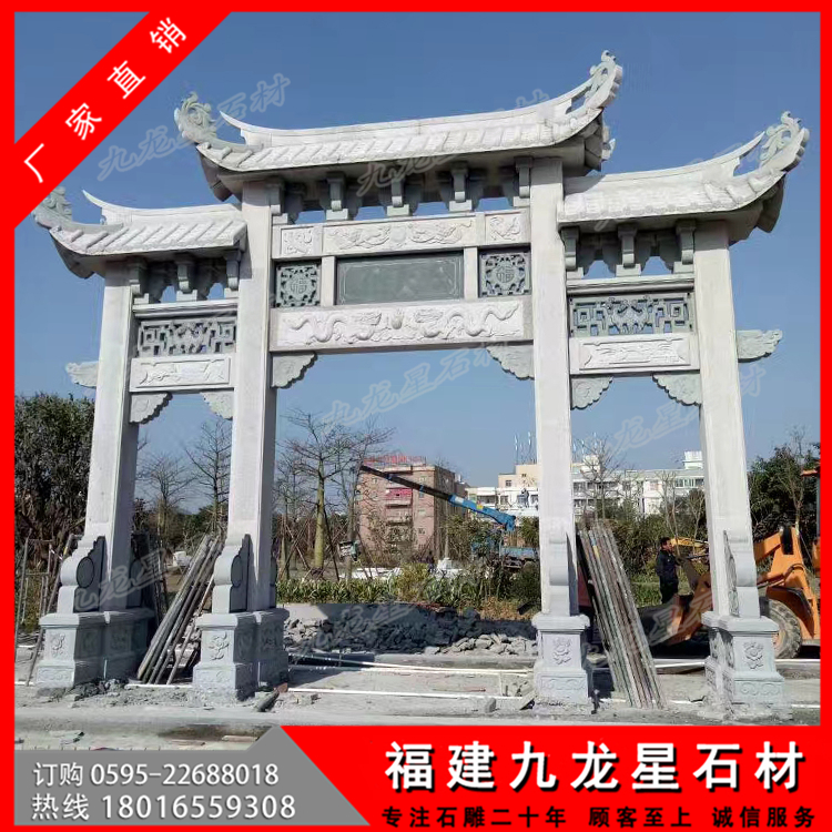 第二:牌坊大小,大型牌坊也有大小之分,筆者見過最大的牌坊高達6米,左右寬12米,深3米,整座牌坊完全采用立柱搭建,造型別致,精妙絕倫,這樣的大型牌坊價格是非常高的,當時聽聞,需要幾千萬制作而成。但是普通的三門牌坊也可以稱之為大型牌坊,價格不過幾萬到十幾萬也非常多。主要是越大的作品,需要加工的工藝和使用的石料都會增加,并且后續(xù)的運輸,安裝也會非常的繁瑣導致的。