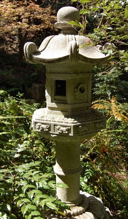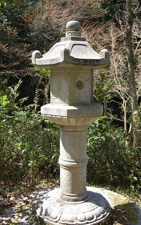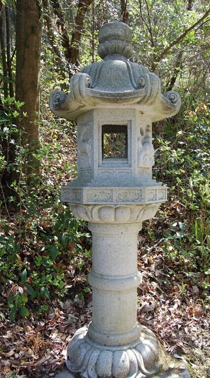 石燈籠的基本構(gòu)造:基礎(chǔ)、燈柱、中坐、火袋、燈頂、寶珠,一般在燈柱的兩端和寶珠的下部雕刻有蓮花的紋案。