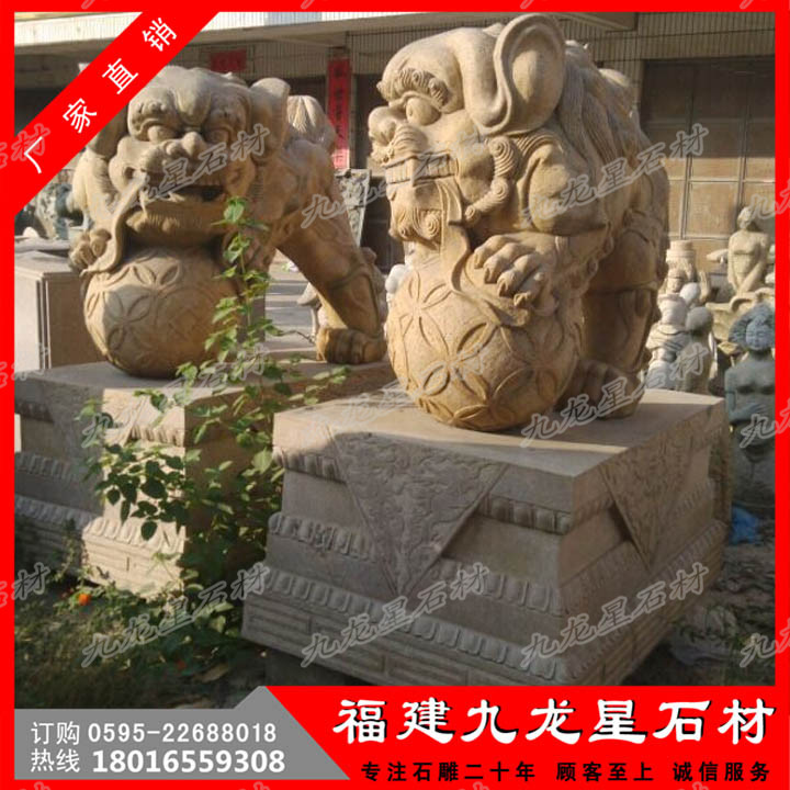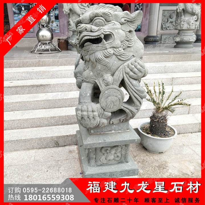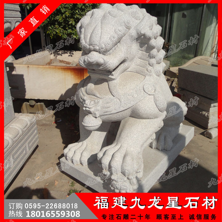 石雕動(dòng)物獅子的腦門寬闊隆起,天庭飽滿,下頜裂開(kāi),地閣方圓.眼窩深,眼球鼓,鼻根深陷,張嘴似欲吞欲笑,多呈憨態(tài).毛發(fā)呈卷曲紐狀,自然地附著頸項(xiàng)部,更顯得威而不怒,猛而不殘.石獅有雌雄兩種:雄獅口含圓珠,耳呈葉狀,兩邊超過(guò)卷毛高度,毛發(fā)卷曲很有規(guī)律,布滿了耳、頸部。有時(shí)腳蹬繡球,表示其性貪玩耍.而雌獅身上多背小石獅子,或足下踩小石獅,表示一種"母愛(ài)",很有情趣,一般情況下,門左置雄獅,門右置雌獅。